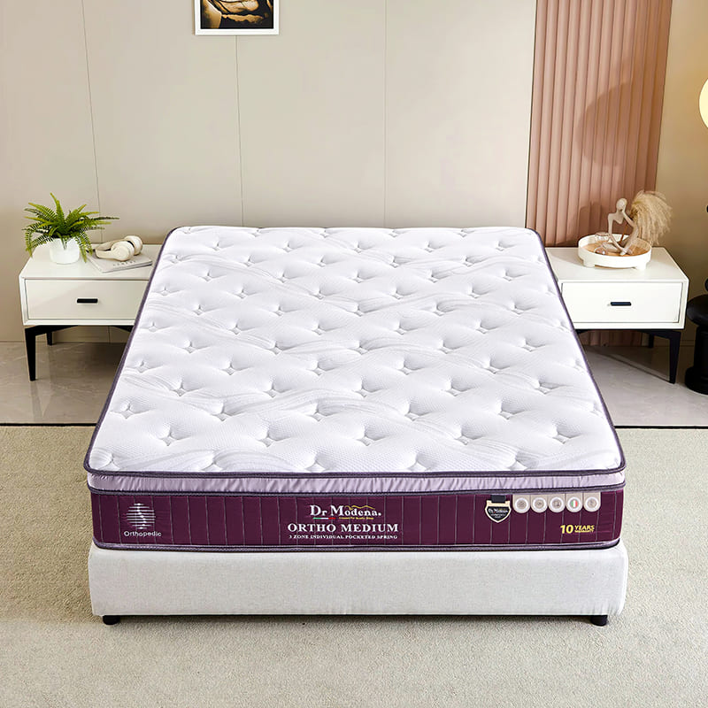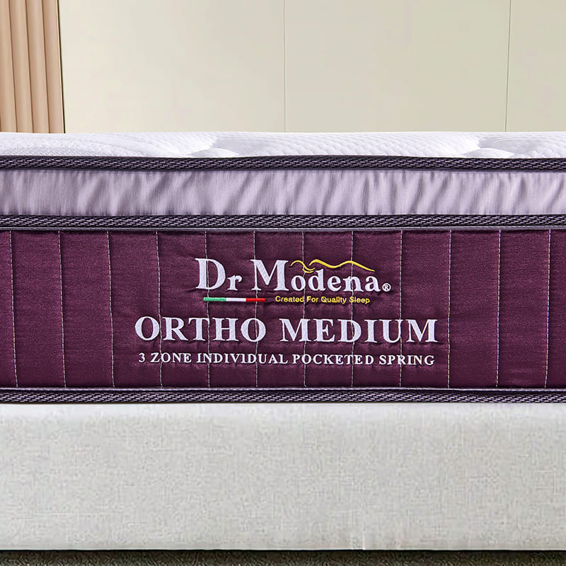 The Dr Modena Orto Medium is a precision-engineered mattress combining the contouring ability of individually pocketed springs with targeted, zoned support. Designed to support spinal alignment while delivering a supremely comfortable sleep, it is ideal for those who want therapeutic support with a gentle, well-balanced feel.